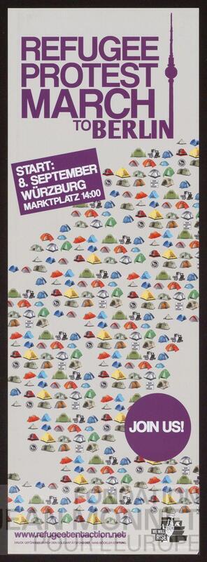 Affiche d'annonce de marche de protestation en lien avec la lutte pour les droits des réfugiés ayant lieu le 8 septembre 2012 à Berlin. Sources pour la date, car le lieu, l'heure et le titre de l'événement correspondent à ce qu'il y a écrit sur l'affiche: https://thevoiceforum.org/node/2711, consulté en ligne le 23 juillet 2025 et https://www.oplatz.net/wurzburg-berlin-refugee-protest-march-video-call/, consulté en ligne le 23 juillet 2025. Responsable au sens du droit de la presse (V.i.S.d.P en allemand): Mohammad Hassanzadeh Kalali
