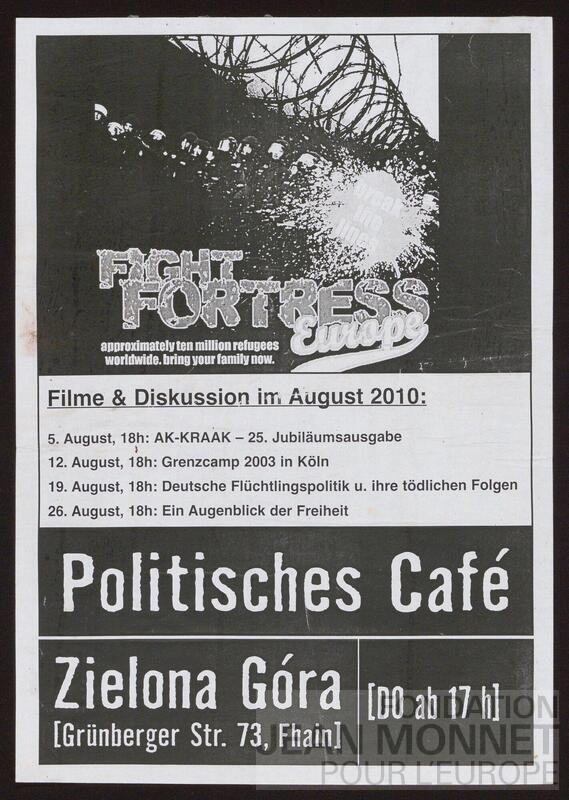 Affiche d'annonce de rencontres, de discussions et de projetction de films au bar Zielona Góra à Berlin