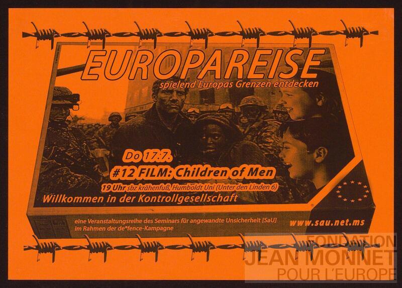 L'affiche C03-0160 a le même titre et utilise également l'idée de jeu de société pour aborder la thématique de la migration vers l'Europe. L'affiche C03-0160 est datée de 2008, date retenue pour cette affiche. Le titre "Europareise : Spielend Europas Grenzen entdecken" est le nom d'un jeu de société produit par l'entreprise Ravensburger dont les affiches C03-0250, C03-261 et C03-262 détournent le design et le titre (source : https://www.spieletest.at/index.php/gesellschaftsspiel/236/europareise, consulté en ligne le 28 juillet 2025)