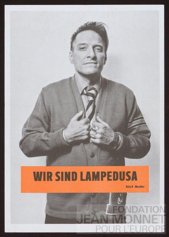 La date retenue correspond aux diverses sources présentant cette série d'affiche (sources : https://www.musikexpress.de/wir-sind-lampedusa-musiker-unterstuetzen-fluechtlinge-in-hamburg-131972/, https://www.ggua.de/aktuelles/einzelansicht/plakataktion-wir-sind-lampedusa/, https://taz.de/Kritik-am-SPD-Senat/!5053943/, consultées en ligne le 29 juillet 2025). On retrouve la même ligne graphique sur les affiches C03-0292, C03-0293, C03-294, C03-295, C03-296, C03-297, C03-298