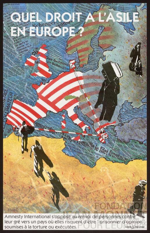 Affiche produite par l'ONG Amnesty International. On peut voir sur l'affiche une mention de "Schengen" : Signé en 1985 et entré en vigueur en 1995, l’accord de Schengen prévoit la libre circulation des personnes entre pays signataires ainsi qu’un renforcement de la surveillance des frontières extérieures (source : Wikipédia, consulté en ligne le 30 juillet 2025)