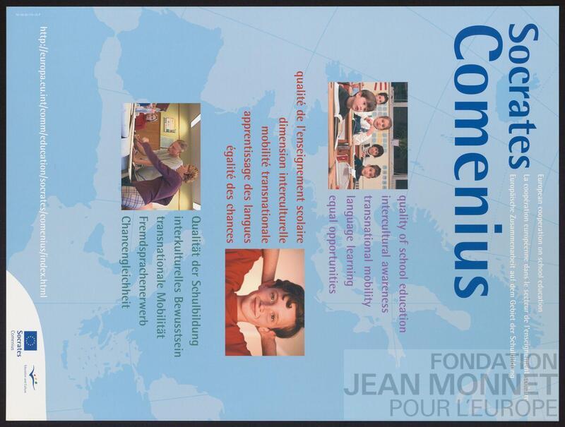 Affiche de promotion du programme Comenius. Le projet Comenius est un projet européen patronné par l'Union européenne, partie du programme d'échanges européens Socrates et lancé en 2002. C'est un projet qui s'étend de la maternelle au secondaire. Il s'adresse à tous les acteurs de la vie éducative : enseignants, élèves, parents d'élèves, associations de parents d'élèves, ONG et collectivités territoriales entre autres (source: Wikipédia, consulté en ligne le 31 juillet 2025). Date de publication trouvée sur l’Office des publications de l’Union européenne, consulté en ligne le 31 juillet 2025.