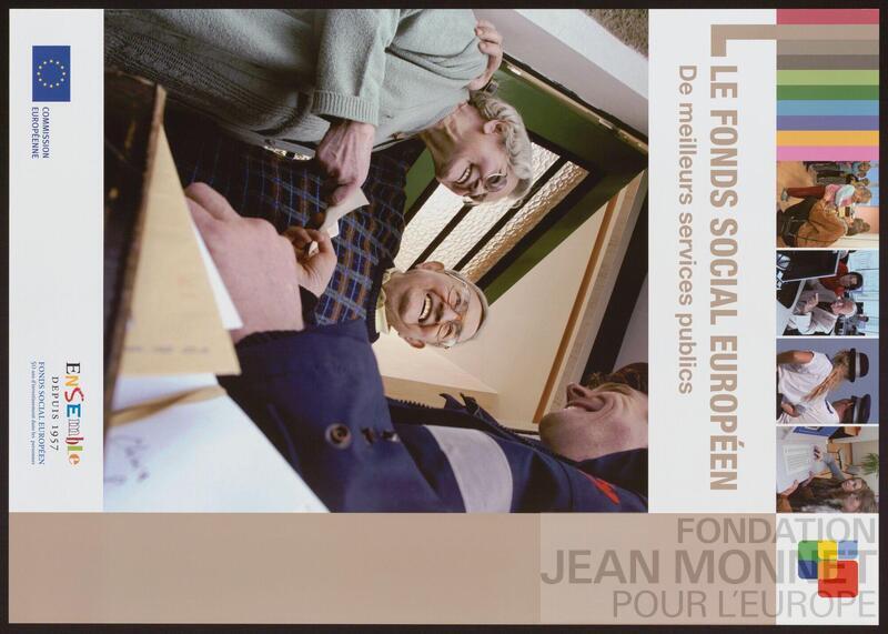 Affiche de promotion du Fonds Social Européen. "Le Fonds social européen est créé avec le traité de Rome de 1957 et fut mis en marche le 11 mai 1960. C’est le plus ancien des fonds structurels. Si l’emploi est depuis toujours son objectif premier, il s’est adapté au fil des années pour répondre aux nouveaux enjeux de son époque. Dans la période d’après-guerre, il s’est concentré sur la gestion de la migration des travailleurs en Europe. Il s’est par la suite attaché à combattre le chômage des jeunes et des travailleurs peu qualifiés. Dans la période de financement 2007-2013, il cherche non seulement à soutenir les personnes qui éprouvent des difficultés particulières à trouver un emploi (notamment les femmes, les jeunes, les travailleurs plus âgés et les personnes handicapées), mais aussi à aider les entreprises et les travailleurs à s’adapter au changement. Il s’efforce pour ce faire de soutenir l’innovation sur le lieu de travail, l’apprentissage tout au long de la vie et la mobilité des travailleurs. Dans ce cadre, le FSE soutient par exemple des structures de retour à l'emploi." (Source : Wikipédia, consulté en ligne le 17 septembre 2025)