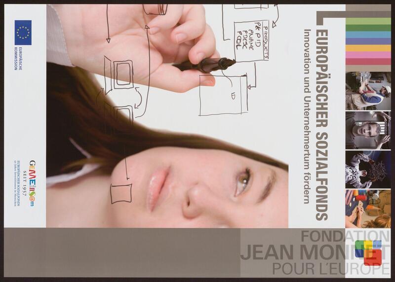 Affiche de promotion du Fonds Social Européen. "Le Fonds social européen est créé avec le traité de Rome de 1957 et fut mis en marche le 11 mai 1960. C’est le plus ancien des fonds structurels. Si l’emploi est depuis toujours son objectif premier, il s’est adapté au fil des années pour répondre aux nouveaux enjeux de son époque. Dans la période d’après-guerre, il s’est concentré sur la gestion de la migration des travailleurs en Europe. Il s’est par la suite attaché à combattre le chômage des jeunes et des travailleurs peu qualifiés. Dans la période de financement 2007-2013, il cherche non seulement à soutenir les personnes qui éprouvent des difficultés particulières à trouver un emploi (notamment les femmes, les jeunes, les travailleurs plus âgés et les personnes handicapées), mais aussi à aider les entreprises et les travailleurs à s’adapter au changement. Il s’efforce pour ce faire de soutenir l’innovation sur le lieu de travail, l’apprentissage tout au long de la vie et la mobilité des travailleurs. Dans ce cadre, le FSE soutient par exemple des structures de retour à l'emploi." (Source : Wikipédia, consulté en ligne le 17 septembre 2025)