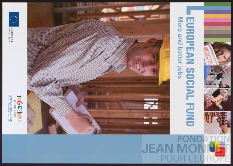 Affiche de promotion du Fonds Social Européen. "Le Fonds social européen est créé avec le traité de Rome de 1957 et fut mis en marche le 11 mai 1960. C’est le plus ancien des fonds structurels. Si l’emploi est depuis toujours son objectif premier, il s’est adapté au fil des années pour répondre aux nouveaux enjeux de son époque. Dans la période d’après-guerre, il s’est concentré sur la gestion de la migration des travailleurs en Europe. Il s’est par la suite attaché à combattre le chômage des jeunes et des travailleurs peu qualifiés. Dans la période de financement 2007-2013, il cherche non seulement à soutenir les personnes qui éprouvent des difficultés particulières à trouver un emploi (notamment les femmes, les jeunes, les travailleurs plus âgés et les personnes handicapées), mais aussi à aider les entreprises et les travailleurs à s’adapter au changement. Il s’efforce pour ce faire de soutenir l’innovation sur le lieu de travail, l’apprentissage tout au long de la vie et la mobilité des travailleurs. Dans ce cadre, le FSE soutient par exemple des structures de retour à l'emploi." (Source : Wikipédia, consulté en ligne le 17 septembre 2025)