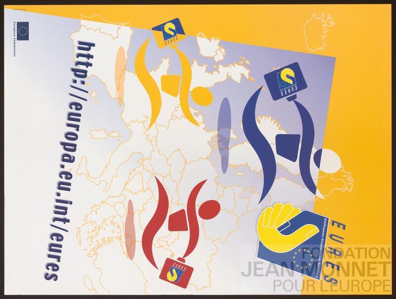 Affiche de promotion d'EURES, l'EURopean Employment Services (Services européens de l'emploi) qui " aide les citoyens et les entreprises des pays de l’UE, de Norvège, d’Islande, du Liechtenstein et de Suisse à tirer parti d’un des quatre principes fondateurs de l’UE, à savoir la libre circulation des travailleurs. [C'] est un réseau européen de coopération entre la Commission européenne, l’Autorité européenne du travail (AET), les services publics nationaux de l’emploi et les autres services de l’emploi autorisés dans tous les pays de l’UE, en Islande, au Liechtenstein, en Norvège et en Suisse. [Il] facilite la libre circulation des travailleurs en fournissant des informations et des services d’aide à l’emploi aux travailleurs et aux employeurs et en renforçant la coopération et l’échange d’informations entre ses organisations membres." (Source : Site web de la Comission européenne, consulté en ligne le 18 septembre 2025). La date est probablement située entre 1994, année de début du programme EURES (Source : https://op.europa.eu/fr/publication-detail/-/publication/b898247e-2013-4442-b756-8c5de4ac6894/language-en, consulté en ligne le 18 septembre 2025) et 2006, année de l'indépendance du Monténégro (source : Wikipédia, consulté en ligne le 18 septembre 2025) qui n'apparaît pas encore sur la carte de l'Europe.