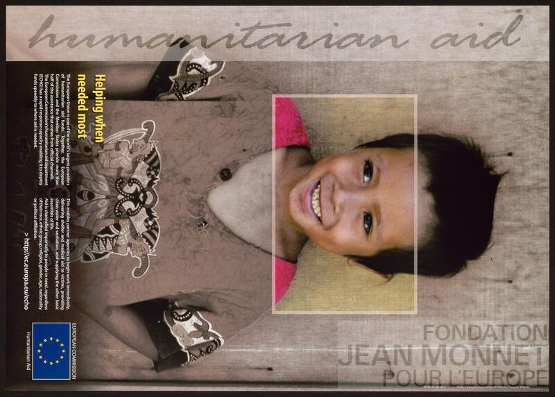 Affiche de promotion de l'aide humanitaire de la Commission européenne. "L’Union européenne fournit une aide humanitaire là où elle est la plus nécessaire et réagit rapidement aux catastrophes d’origine humaine et aux catastrophes naturelles. Un engagement fort en faveur de la protection des victimes les plus vulnérables est au cœur de cet effort.L’aide de l’UE repose sur les principes humanitaires internationaux et le consensus européen sur l’aide humanitaire et est guidée par l’équité et l’impartialité. L'aide parvient aux populations touchées, sans discrimination (sans considérations de race, d'appartenance à un groupe ethnique, de religion, de sexe, d'âge, de nationalité ou d'affiliation politique). Ensemble, les États membres et les institutions de l’UE figurent parmi les principaux donateurs d'aide humanitaire et font preuve de solidarité à l’égard de ceux qui en ont besoin de toute urgence dans le monde entier. [...] Depuis 1992, la Commission européenne fournit une aide humanitaire dans plus de 110 pays, dont bénéficient des millions de personnes dans le monde chaque année." (Source : Site web de la Commission européenne, consulté en ligne le 23 septembre 2025)
