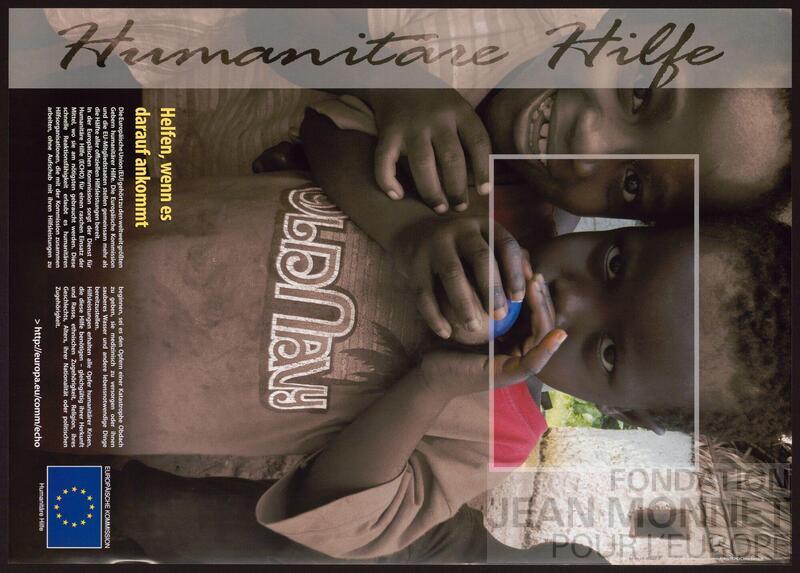 Affiche de promotion de l'aide humanitaire de la Commission européenne. "L’Union européenne fournit une aide humanitaire là où elle est la plus nécessaire et réagit rapidement aux catastrophes d’origine humaine et aux catastrophes naturelles. Un engagement fort en faveur de la protection des victimes les plus vulnérables est au cœur de cet effort.L’aide de l’UE repose sur les principes humanitaires internationaux et le consensus européen sur l’aide humanitaire et est guidée par l’équité et l’impartialité. L'aide parvient aux populations touchées, sans discrimination (sans considérations de race, d'appartenance à un groupe ethnique, de religion, de sexe, d'âge, de nationalité ou d'affiliation politique). Ensemble, les États membres et les institutions de l’UE figurent parmi les principaux donateurs d'aide humanitaire et font preuve de solidarité à l’égard de ceux qui en ont besoin de toute urgence dans le monde entier. [...] Depuis 1992, la Commission européenne fournit une aide humanitaire dans plus de 110 pays, dont bénéficient des millions de personnes dans le monde chaque année." (Source : Site web de la Commission européenne, consulté en ligne le 23 septembre 2025)