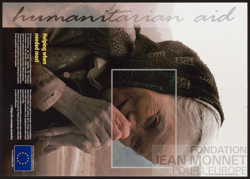 Affiche de promotion de l'aide humanitaire de la Commission européenne. "L’Union européenne fournit une aide humanitaire là où elle est la plus nécessaire et réagit rapidement aux catastrophes d’origine humaine et aux catastrophes naturelles. Un engagement fort en faveur de la protection des victimes les plus vulnérables est au cœur de cet effort.L’aide de l’UE repose sur les principes humanitaires internationaux et le consensus européen sur l’aide humanitaire et est guidée par l’équité et l’impartialité. L'aide parvient aux populations touchées, sans discrimination (sans considérations de race, d'appartenance à un groupe ethnique, de religion, de sexe, d'âge, de nationalité ou d'affiliation politique). Ensemble, les États membres et les institutions de l’UE figurent parmi les principaux donateurs d'aide humanitaire et font preuve de solidarité à l’égard de ceux qui en ont besoin de toute urgence dans le monde entier. [...] Depuis 1992, la Commission européenne fournit une aide humanitaire dans plus de 110 pays, dont bénéficient des millions de personnes dans le monde chaque année." (Source : Site web de la Commission européenne, consulté en ligne le 23 septembre 2025)
