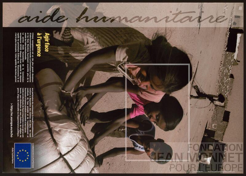 Affiche de promotion de l'aide humanitaire de la Commission européenne. "L’Union européenne fournit une aide humanitaire là où elle est la plus nécessaire et réagit rapidement aux catastrophes d’origine humaine et aux catastrophes naturelles. Un engagement fort en faveur de la protection des victimes les plus vulnérables est au cœur de cet effort.L’aide de l’UE repose sur les principes humanitaires internationaux et le consensus européen sur l’aide humanitaire et est guidée par l’équité et l’impartialité. L'aide parvient aux populations touchées, sans discrimination (sans considérations de race, d'appartenance à un groupe ethnique, de religion, de sexe, d'âge, de nationalité ou d'affiliation politique). Ensemble, les États membres et les institutions de l’UE figurent parmi les principaux donateurs d'aide humanitaire et font preuve de solidarité à l’égard de ceux qui en ont besoin de toute urgence dans le monde entier. [...] Depuis 1992, la Commission européenne fournit une aide humanitaire dans plus de 110 pays, dont bénéficient des millions de personnes dans le monde chaque année." (Source : Site web de la Commission européenne, consulté en ligne le 23 septembre 2025)