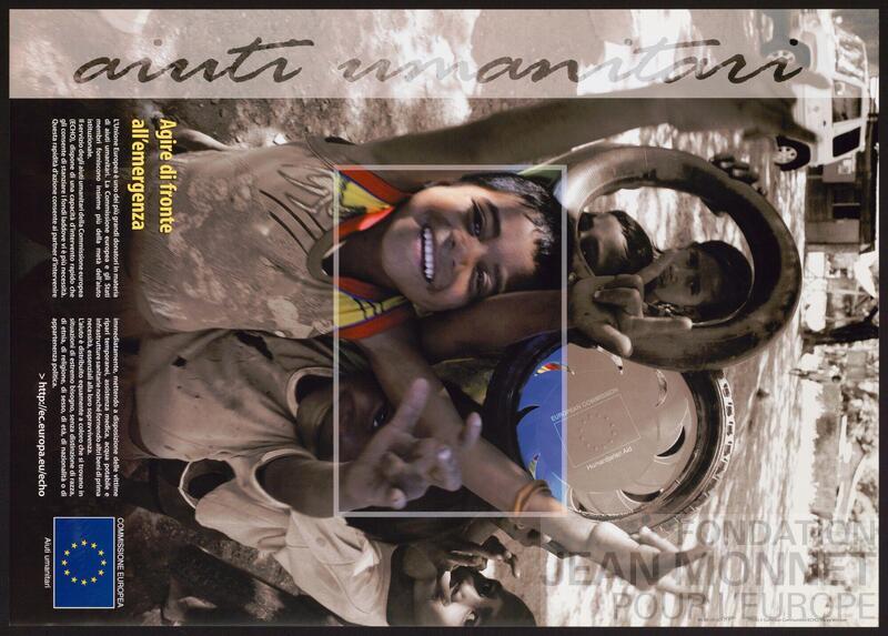Affiche de promotion de l'aide humanitaire de la Commission européenne. "L’Union européenne fournit une aide humanitaire là où elle est la plus nécessaire et réagit rapidement aux catastrophes d’origine humaine et aux catastrophes naturelles. Un engagement fort en faveur de la protection des victimes les plus vulnérables est au cœur de cet effort.L’aide de l’UE repose sur les principes humanitaires internationaux et le consensus européen sur l’aide humanitaire et est guidée par l’équité et l’impartialité. L'aide parvient aux populations touchées, sans discrimination (sans considérations de race, d'appartenance à un groupe ethnique, de religion, de sexe, d'âge, de nationalité ou d'affiliation politique). Ensemble, les États membres et les institutions de l’UE figurent parmi les principaux donateurs d'aide humanitaire et font preuve de solidarité à l’égard de ceux qui en ont besoin de toute urgence dans le monde entier. [...] Depuis 1992, la Commission européenne fournit une aide humanitaire dans plus de 110 pays, dont bénéficient des millions de personnes dans le monde chaque année." (Source : Site web de la Commission européenne, consulté en ligne le 23 septembre 2025)