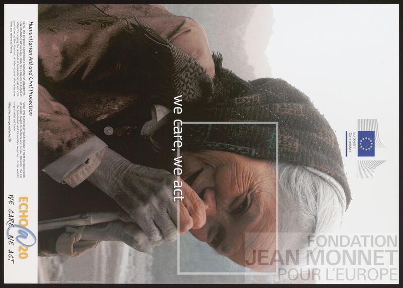 Affiche de promotion de L'Office humanitaire de la Communauté européenne (ECHO) à l'occasion des vingt ans de sa création. "[Il] a été fondé en 1992 par la deuxième commission Delors. L'office est devenu la Direction générale de l'aide humanitaire en 2004. En 2009, le bureau a été rebaptisé service d'aide humanitaire et de protection civile de la Commission européenne ou de l'Union européenne, mais a néanmoins conservé son acronyme ECHO." (Source : Wikipédia, consulté en ligne le 25 septembre 2025). La date a pu être déterminée grâce au petit texte explicatif en bas de l'affiche et qui nous donne les informations suivantes : "ECHO, le service humanitaire de la Commission européenne, a été créé il y a 20 ans. [...] Depuis 1992, ECHO a consacré [...].". On peut noter que la ligne graphique est la même que pour les affiches C04-173 à C04-186.
