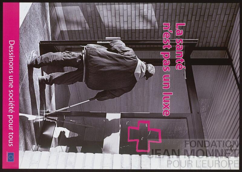 L'affiche présente la photographie en noir et blanc d'une personne en béquille entrant dans un bâtiment. Sur la porte de droite, il y a le dessin stylisé d'une croix médicale.
