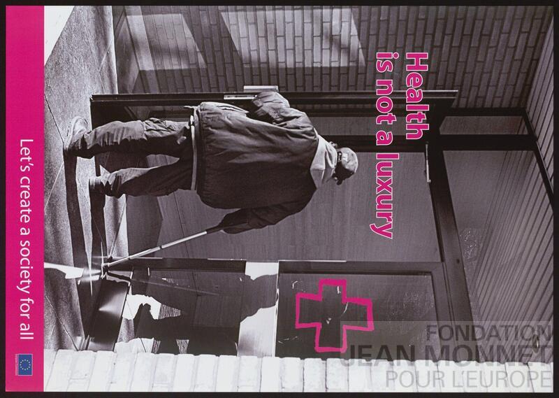 L'affiche présente la photographie en noir et blanc d'une personne en béquille entrant dans un bâtiment. Sur la porte de droite, il y a le dessin stylisé d'une croix médicale.