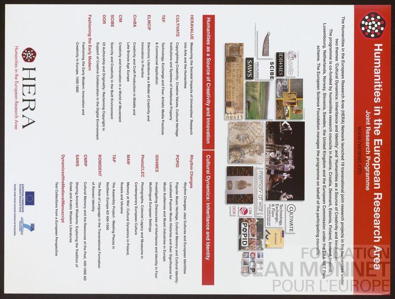 "HERA – Humanities in the European Research Area [Les sciences humaines dans l'Espace européen de la recherche] – est un partenariat entre 26 conseils de recherche en sciences humaines à travers l'Europe et la Commission européenne, dont l'objectif est d'ancrer solidement les sciences humaines dans l'Espace européen de la recherche et dans les programmes-cadres de la Commission européenne. Nous nous engageons à diriger et à développer des opportunités de financement pour les chercheurs en sciences humaines en Europe." (Source : https://heranet.info/about-us/who-we-are/, consulté en ligne le 30 septembre 2025). Les dates correspondent à celles des programmes de recherche mentionnés sur l'affiche (Sources : https://heranet.info/projects/hera-2009-humanities-as-a-source-of-creativity-and-innovation/ ; https://heranet.info/projects/hera-i-cultural-dynamics-inheritance-and-identity/, consultées en ligne le 30 septembre 2025)