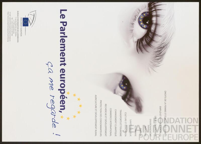 L'affiche présente la photographie d'un visage féminin dont les yeux sont aux couleurs du drapeau européen.