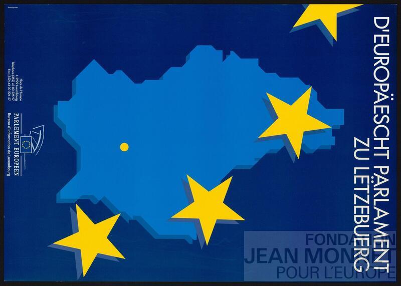 L'affiche présente un dessin stylisé du Luxembourg sur un fond bleu azur avec des étoiles européennes