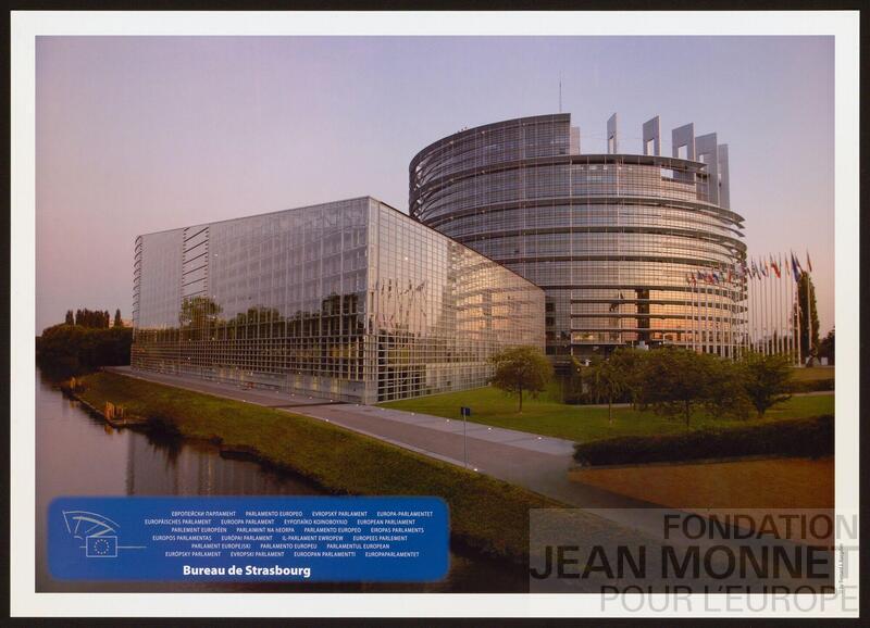 L'affiche présente la photographie du bâtiment du parlement européen à Strasbourg
