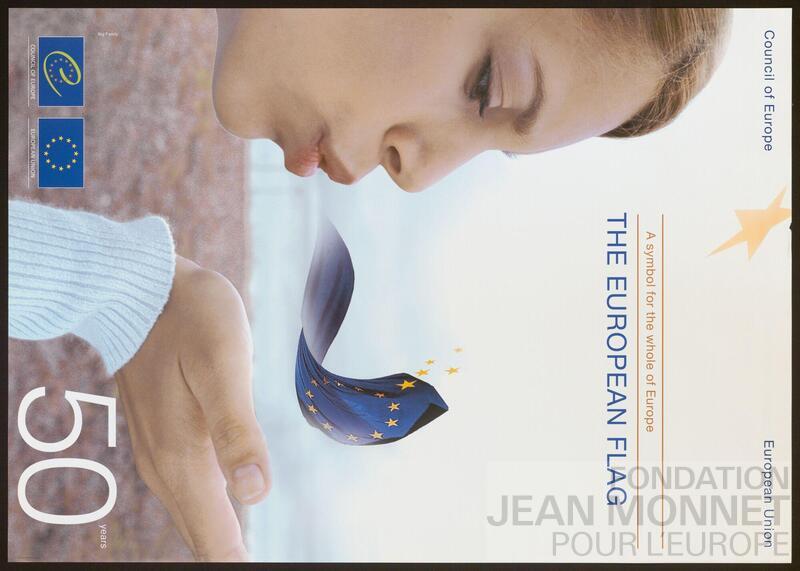 Affiche de promotion de l'Union européenne et du conseil de l'Europe à l'occasion des 50 ans du drapeau européen. La date de l'affiche a pu être déterminée grâce à l'année d'adoption du drapeau par le conseil de l'Europe comme symbole de l'unité européenne en 1955 (Source : Wikipédia, consulté en ligne le 07 octobre 2025).
