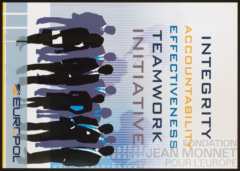 Affiche de promotion d'Europol qui "est une agence européenne de police criminelle qui facilite l'échange de renseignements entre polices nationales en matière de stupéfiants, de terrorisme, de criminalité internationale et de pédocriminalité au sein de l'Union européenne." (Source : Wikipédia, consulté en ligne le 07 octobre 2025). La date de publication a été trouvée sur le site de l'Office des Publications de l'union européenne, consulté en ligne le 07 octobre 2025.