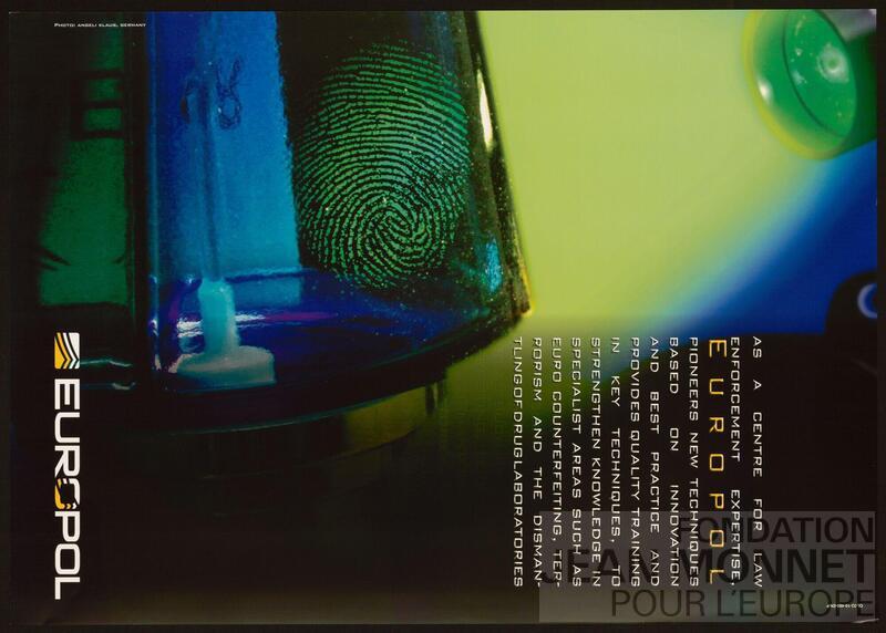 Affiche de promotion d'Europol qui "est une agence européenne de police criminelle qui facilite l'échange de renseignements entre polices nationales en matière de stupéfiants, de terrorisme, de criminalité internationale et de pédocriminalité au sein de l'Union européenne." (Source : Wikipédia, consulté en ligne le 07 octobre 2025). La date de publication a été trouvée sur le site de l'Office des Publications de l'union européenne, consulté en ligne le 07 octobre 2025.