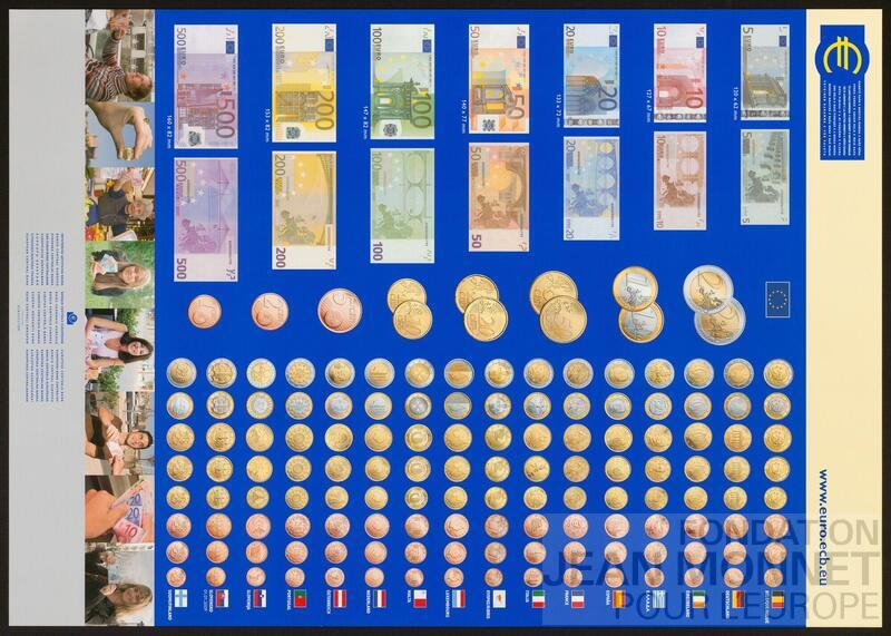 L'affiche présente d'un côté les billets et les pièces d'Euro, de l'autre les différentes faces des pièces par pays et en bas, des photographies de personnes utilisant l'Euro.