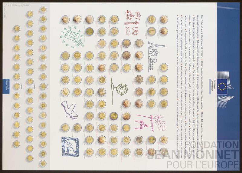 Affiche de la Direction générale des affaires économiques et financières de la Commission européenne pour le dixième anniversaire de l'Euro. Date de publication trouvée sur le site de l'Office des Publications de l'union européenne, consulté en ligne le 08 octobre 2025.