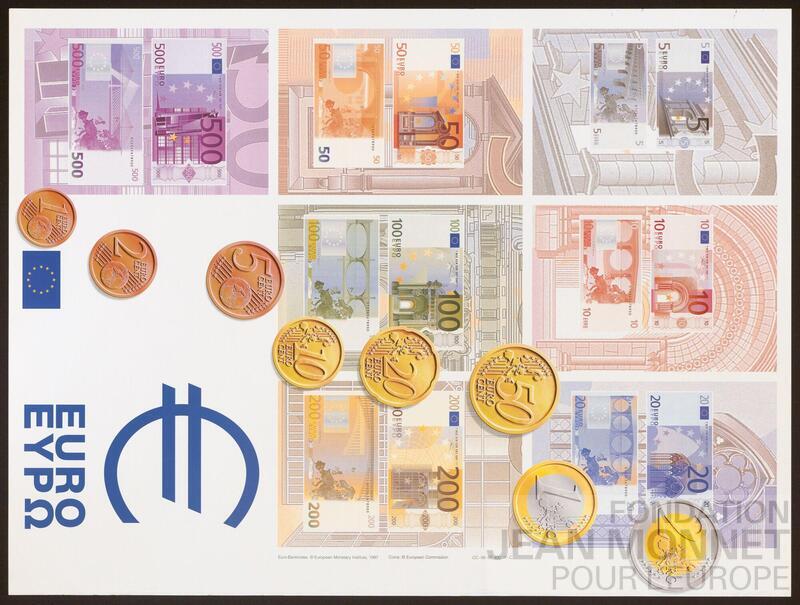 Affiche de la Commission européenne pour la promotion de la nouvelle monnaie unique européenne, l'Euro. Dates de publications trouvées sur le site de l'Office de Publications de l'union européenne, consulté en ligne le 08 octobre 2025.