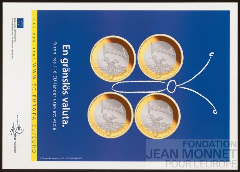 Affiche de la Direction générale des affaires économiques et financières de la Commission européenne pour la promotion de l'Euro. Date de publication trouvée sur le site de l'Office des Publications de l'union européenne, consulté en ligne le 09 octobre 2025.