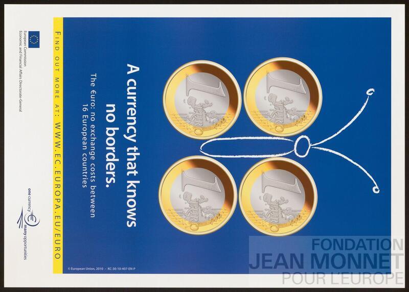 Affiche de la Direction générale des affaires économiques et financières de la Commission européenne pour la promotion de l'Euro. Date de publication trouvée sur le site de l'Office des Publications de l'union européenne, consulté en ligne le 09 octobre 2025.
