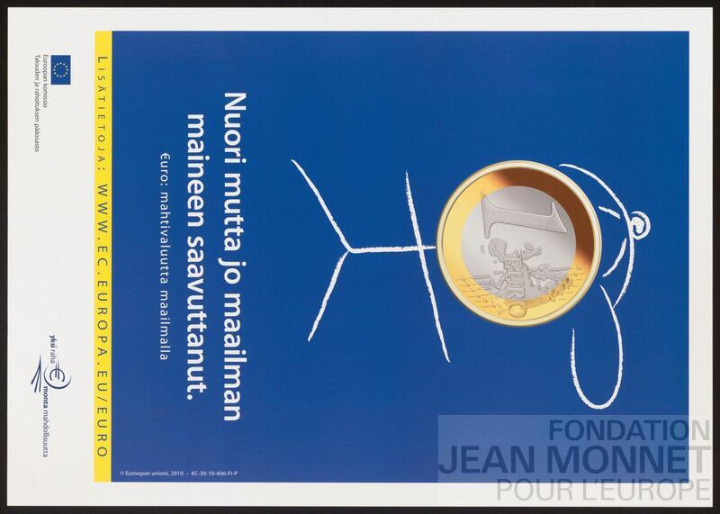 Affiche de la Direction générale des affaires économiques et financières de la Commission européenne pour la promotion de l'Euro. Date de publication trouvée sur le site de l'Office des Publications de l'union européenne, consulté en ligne le 09 octobre 2025.