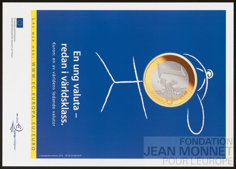 Affiche de la Direction générale des affaires économiques et financières de la Commission européenne pour la promotion de l'Euro. Date de publication trouvée sur le site de l'Office des Publications de l'union européenne, consulté en ligne le 09 octobre 2025.