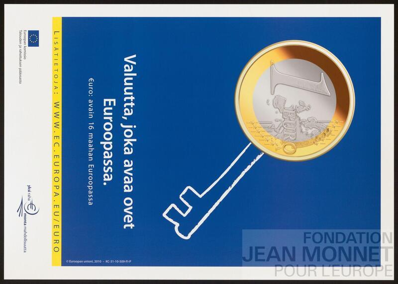 Affiche de la Direction générale des affaires économiques et financières de la Commission européenne pour la promotion de l'Euro. Date de publication trouvée sur le site de l'Office des Publications de l'union européenne, consulté en ligne le 09 octobre 2025.
