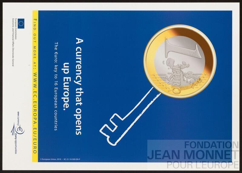 Affiche de la Direction générale des affaires économiques et financières de la Commission européenne pour la promotion de l'Euro. Date de publication trouvée sur le site de l'Office des Publications de l'union européenne, consulté en ligne le 09 octobre 2025.