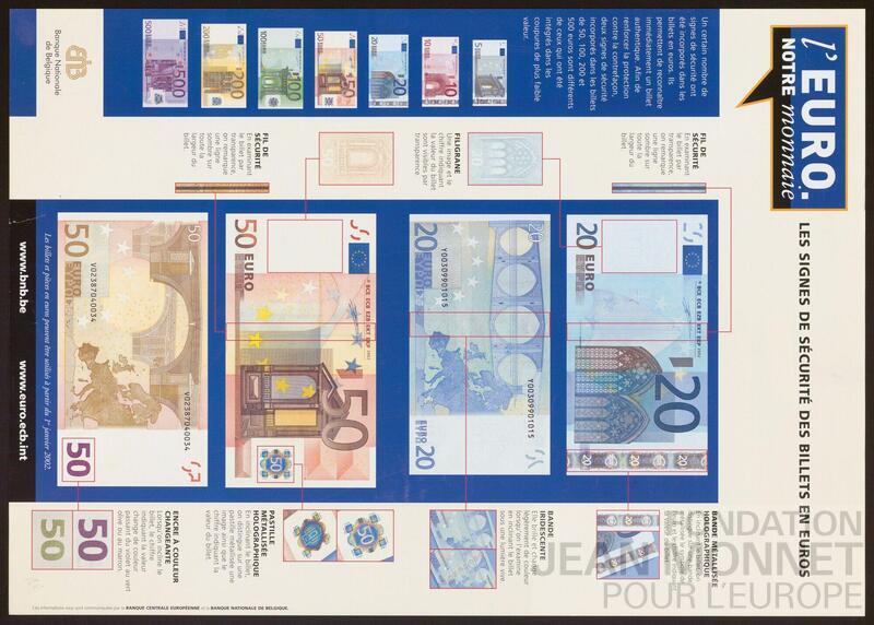 Affiche de la Banque Centrale Européenne et de la Banque Nationale de Belgique pour présenter les différents signes de sécurités présents sur les billets de banque de l'Euro.