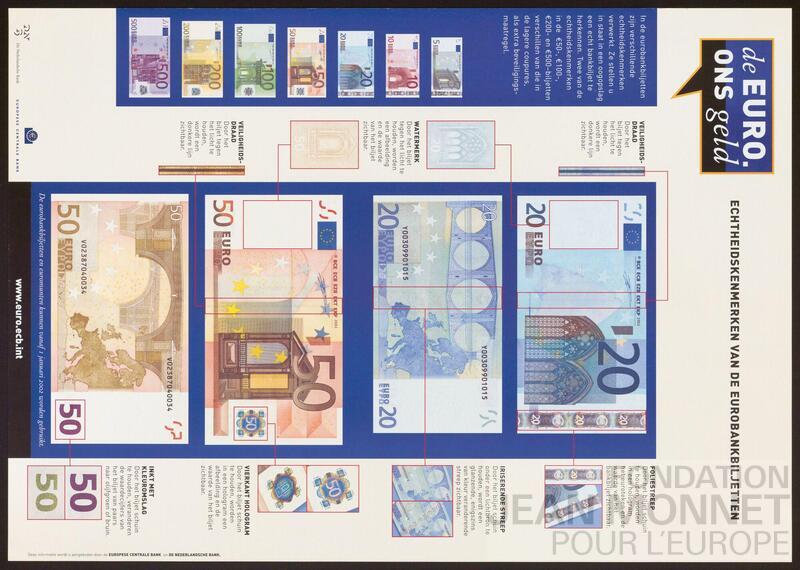 Affiche de la Banque Centrale Européenne et de la Banque de la Banque des Pays-bas pour présenter les différents signes de sécurités présents sur les billets de banque de l'Euro.