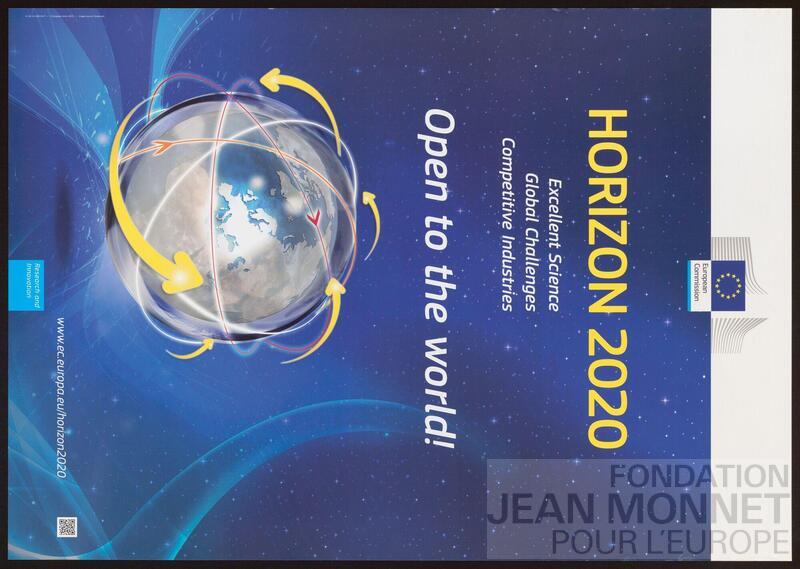 Affiche de promotion de la direction générale de la recherche et de l’innovation de la Commission européenne pour le programme de recherche Horizon 2020 qui est "[...] le plus grand programme de recherche et d'innovation jamais mis en place par l'UE, avec près de 80 milliards d'euros de financement disponibles sur 7 ans (2014 à 2020), sans compter les investissements privés que ces fonds vont attirer. Il promet davantage de percées, de découvertes et de premières mondiales en permettant aux idées novatrices de passer du laboratoire au marché." (traduit avec le programme Deepl) (Source : https://wayback.archive-it.org/12090/20220124080448/https://ec.europa.eu/programmes/horizon2020/en/what-horizon-2020, consulté en ligne le 09 octobre 2025). Date de publication trouvée sur le site de l'Office des Publications de l'union européenne, consulté en ligne le 09 octobre 2025.