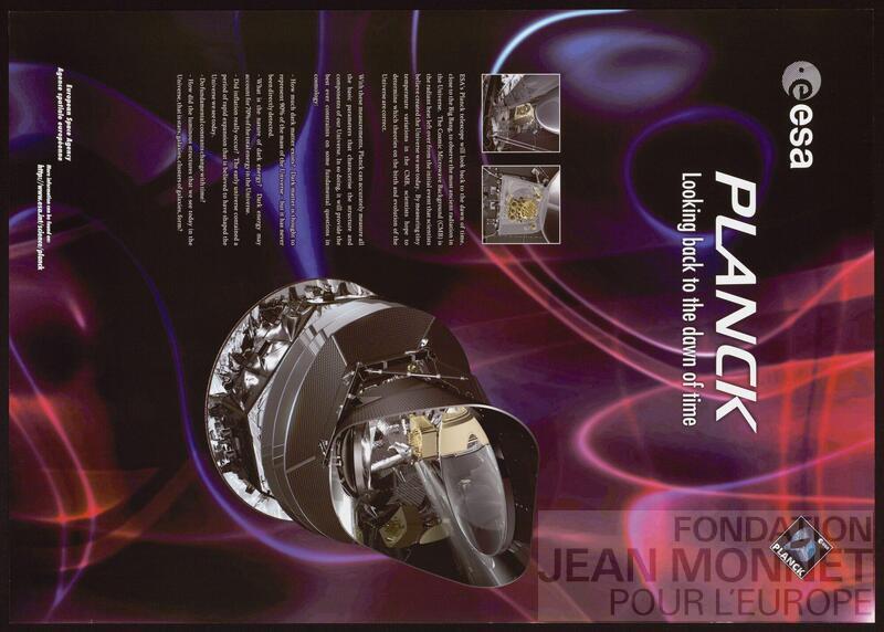 Affiche de l'Agence Spatiale Européenne pour la promotion du programme PLANCK. "Planck est un observatoire spatial développé par l'Agence spatiale européenne (ESA) avec une participation de l'agence spatiale américaine, la NASA. La mission du satellite est de cartographier les infimes variations de température (ou d'intensité) du fond diffus cosmologique, rayonnement dans le domaine micro-onde montrant l'Univers tel qu'il est 380 000 ans après le Big Bang." (Source : Wikipédia, consulté en ligne le 09 octobre 2025). date de publication déterminée avec le site de l'Agence Spatiale Européenne (Source : https://sci.esa.int/s/8YY3n18, consulté en ligne le 09 octobre 2025).