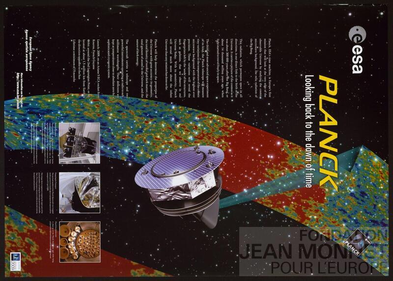 Affiche de l'Agence Spatiale Européenne pour la promotion du programme PLANCK. "Planck est un observatoire spatial développé par l'Agence spatiale européenne (ESA) avec une participation de l'agence spatiale américaine, la NASA. La mission du satellite est de cartographier les infimes variations de température (ou d'intensité) du fond diffus cosmologique, rayonnement dans le domaine micro-onde montrant l'Univers tel qu'il est 380 000 ans après le Big Bang." (Source : Wikipédia, consulté en ligne le 09 octobre 2025). Date de publication trouvée sur le site de l'Agence Spatiale Européenne (Source : https://sci.esa.int/s/wN42BB8, consulté en ligne le 09 octobre 2025).