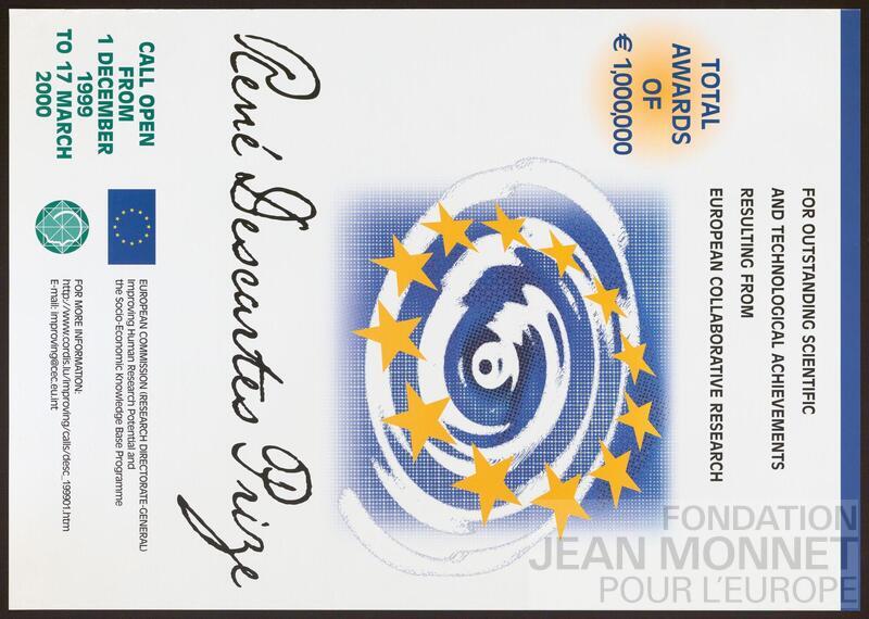 Affiche de la Commission Européenne pour le Prix René Descartes. "Le prix Descartes était un prix scientifique annuel décerné par l'Union européenne, nommé en l'honneur du mathématicien et philosophe français René Descartes. Ce prix récompensait les réalisations scientifiques et technologiques exceptionnelles issues de la recherche collaborative européenne. Le prix de recherche a été décerné pour la première fois en 2000 et a été supprimé en 2007."(traduit avec le programme Deepl) (Source : Wikipédia, consulté en ligne le. Date de publication trouvée sur le site de l'Office des publications de l'Union européenne, consulté en ligne le 13 octobre 2025.