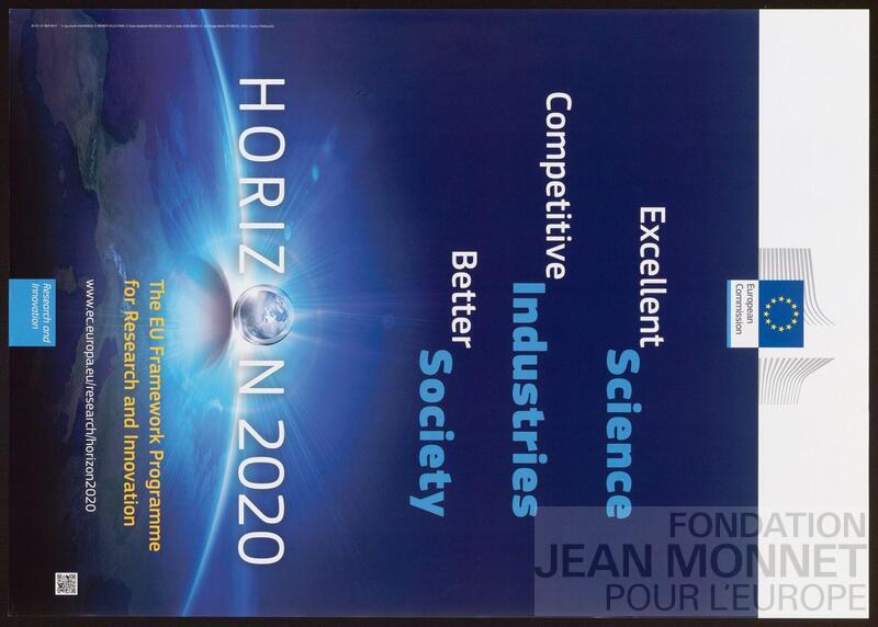 Affiche de promotion de la direction générale de la recherche et de l’innovation de la Commission européenne pour le programme de recherche Horizon 2020 qui est "[...] le plus grand programme de recherche et d'innovation jamais mis en place par l'UE, avec près de 80 milliards d'euros de financement disponibles sur 7 ans (2014 à 2020), sans compter les investissements privés que ces fonds vont attirer. Il promet davantage de percées, de découvertes et de premières mondiales en permettant aux idées novatrices de passer du laboratoire au marché." (traduit avec le programme Deepl) (Source : https://wayback.archive-it.org/12090/20220124080448/https://ec.europa.eu/programmes/horizon2020/en/what-horizon-2020, consulté en ligne le 13 octobre 2025). Date de publication trouvée sur le site de l'Office des Publications de l'union européenne, consulté en ligne le 13 octobre 2025.