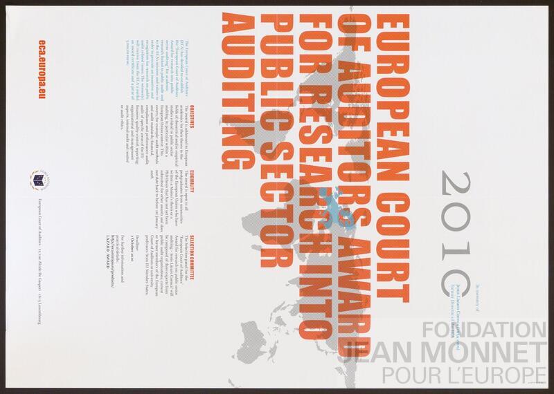 Affiche de promotion de la Cour des Comptes Européenne pour le prix de la Cour des comptes européenne. "La Cour des comptes européenne a créé en 2010 les «Prix de la Cour des comptes européenne», décernés tous les deux ans, dans le but d'encourager et de récompenser les travaux de recherche originaux consacrés aux questions de responsabilité dans le domaine de l'audit public." (traduit avec le programme Deepl) (Source : https://www.eca.europa.eu/en/Documents/2022_ECA-Awards-terms-and-conditions.pdf, consulté en ligne le 14 octobre 2025). Date de publication trouvée sur l'Office des Publications de l'union européenne, consulté en ligne le 14 octobre 2025.