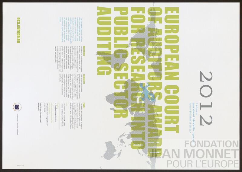 Affiche de promotion de la Cour des Comptes Européenne pour le prix de la Cour des comptes européenne. "La Cour des comptes européenne a créé en 2010 les «Prix de la Cour des comptes européenne», décernés tous les deux ans, dans le but d'encourager et de récompenser les travaux de recherche originaux consacrés aux questions de responsabilité dans le domaine de l'audit public." (traduit avec le programme Deepl) (Source : https://www.eca.europa.eu/en/Documents/2022_ECA-Awards-terms-and-conditions.pdf, consulté en ligne le 14 octobre 2025). Date de publication trouvée sur l'Office des Publications de l'union européenne, consulté en ligne le 14 octobre 2025.