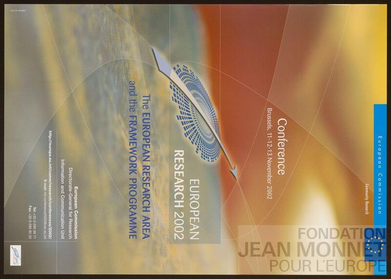 Affiche de promotion de la direction générale de la recherche de la Commission européenne pour une conférence sur le thème de la recherche européenne en 2002.