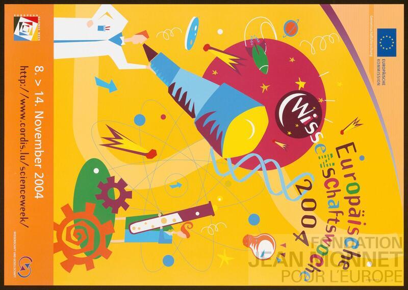 Affiche de la promotion de la Commission européenne pour la semaine européenne de la science de 2004 qui, "[à] travers des activités stimulantes et une approche paneuropéenne, [...] a pour mission de créer une perspective totalement nouvelle sur la science. L'accent est mis sur la démonstration, plutôt que sur l'explication, de l'impact de la science et de la technologie sur la vie des Européens, des gadgets les plus simples à la technologie satellitaire la plus sophistiquée. La science est avant tout une quête de connaissances et de moyens permettant d'améliorer nos vies, nos modes de vie et notre environnement." (traduit avec le programme Deepl) (Source : https://web.archive.org/web/20041013071736/http://www.cordis.lu/scienceweek/home.htm, consulté en ligne le 14 octobre 2025)