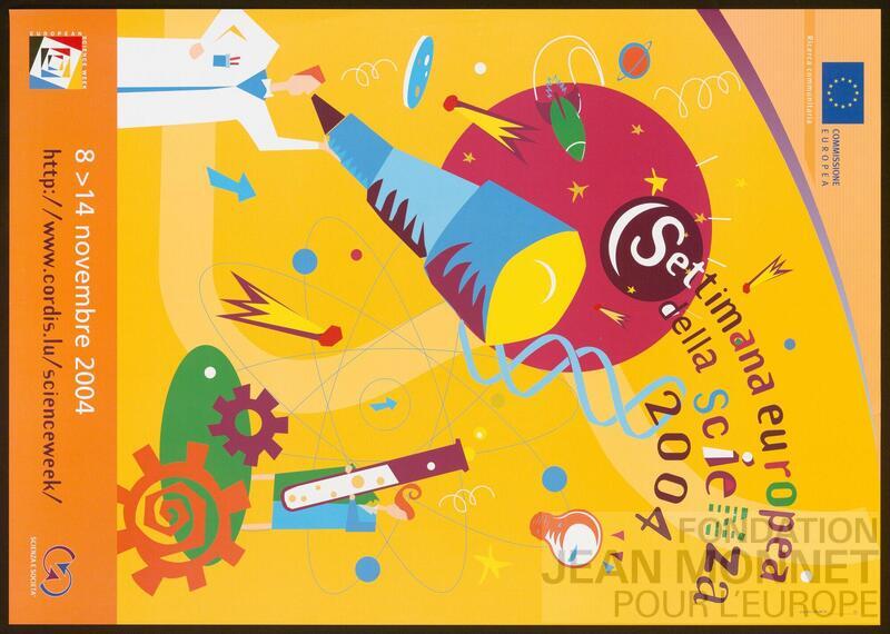 Affiche de la promotion de la Commission européenne pour la semaine européenne de la science de 2004 qui, "[à] travers des activités stimulantes et une approche paneuropéenne, [...] a pour mission de créer une perspective totalement nouvelle sur la science. L'accent est mis sur la démonstration, plutôt que sur l'explication, de l'impact de la science et de la technologie sur la vie des Européens, des gadgets les plus simples à la technologie satellitaire la plus sophistiquée. La science est avant tout une quête de connaissances et de moyens permettant d'améliorer nos vies, nos modes de vie et notre environnement." (traduit avec le programme Deepl) (Source : https://web.archive.org/web/20041013071736/http://www.cordis.lu/scienceweek/home.htm, consulté en ligne le 14 octobre 2025)