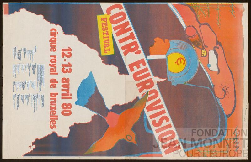 Affiche de promotion pour le festival Contr'Eurovision au cirque Royal de Bruxelles."[Cet événement] a été organisé par l'association représentative des travailleurs CAFIT (Collectif d'Animation pour la Formation et l'Information des Travailleurs) et le groupe militant Pour le Socialisme, et s'est déroulé [pour la première édition] à la salle de concert Cirque Royal à Bruxelles les 31 mars et 1er avril 1979. [Il] a été organisé comme une alternative à la pop conservatrice et sans doute un peu ringarde de l'Eurovision traditionnelle de l'époque, considérée par beaucoup de gens de gauche comme un spectacle extravagant de « pain et cirque »." (traduit avec le programme Deepl) (Source : https://www.rte.ie/culture/2023/0511/1360650-eurovision-dissenters-and-the-making-of-a-classic-reggae-album/, Consulté en ligne le 20 octobre 2025)