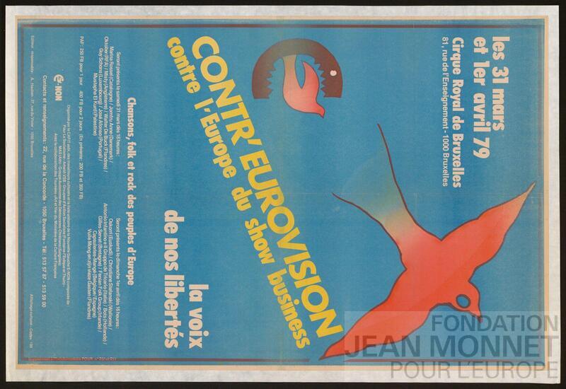 Affiche de promotion pour le festival Contr'Eurovision au cirque Royal de Bruxelles."[Cet événement] a été organisé par l'association représentative des travailleurs CAFIT (Collectif d'Animation pour la Formation et l'Information des Travailleurs) et le groupe militant Pour le Socialisme, et s'est déroulé [pour la première édition] à la salle de concert Cirque Royal à Bruxelles les 31 mars et 1er avril 1979. [Il] a été organisé comme une alternative à la pop conservatrice et sans doute un peu ringarde de l'Eurovision traditionnelle de l'époque, considérée par beaucoup de gens de gauche comme un spectacle extravagant de « pain et cirque »." (traduit avec le programme Deepl) (Source : https://www.rte.ie/culture/2023/0511/1360650-eurovision-dissenters-and-the-making-of-a-classic-reggae-album/, Consulté en ligne le 20 octobre 2025)
