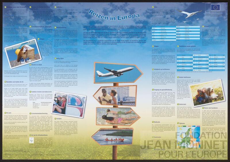 L’affiche représente de nombreux textes sur le voyage, un panneau dans une plaine représentant quatre images liées aux vacances ainsi que trois photos et une carte de l’Europe