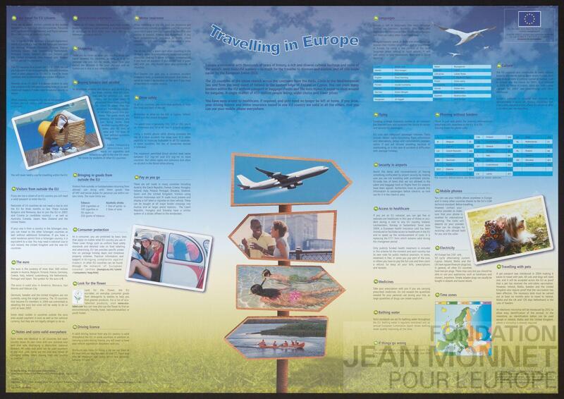 L’affiche représente de nombreux textes sur le voyage, un panneau dans une plaine représentant quatre images liées aux vacances ainsi que trois photos et une carte de l’Europe